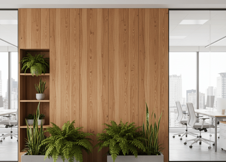 Em projetos sob medida, a divisória de vidro acústico é combinada com painéis de MDF (que oferecem absorção sonora). O vidro é usado para manter a luz e a visibilidade, enquanto o MDF é posicionado estrategicamente para o máximo isolamento (ex: paredes que separam áreas de muito ruído).