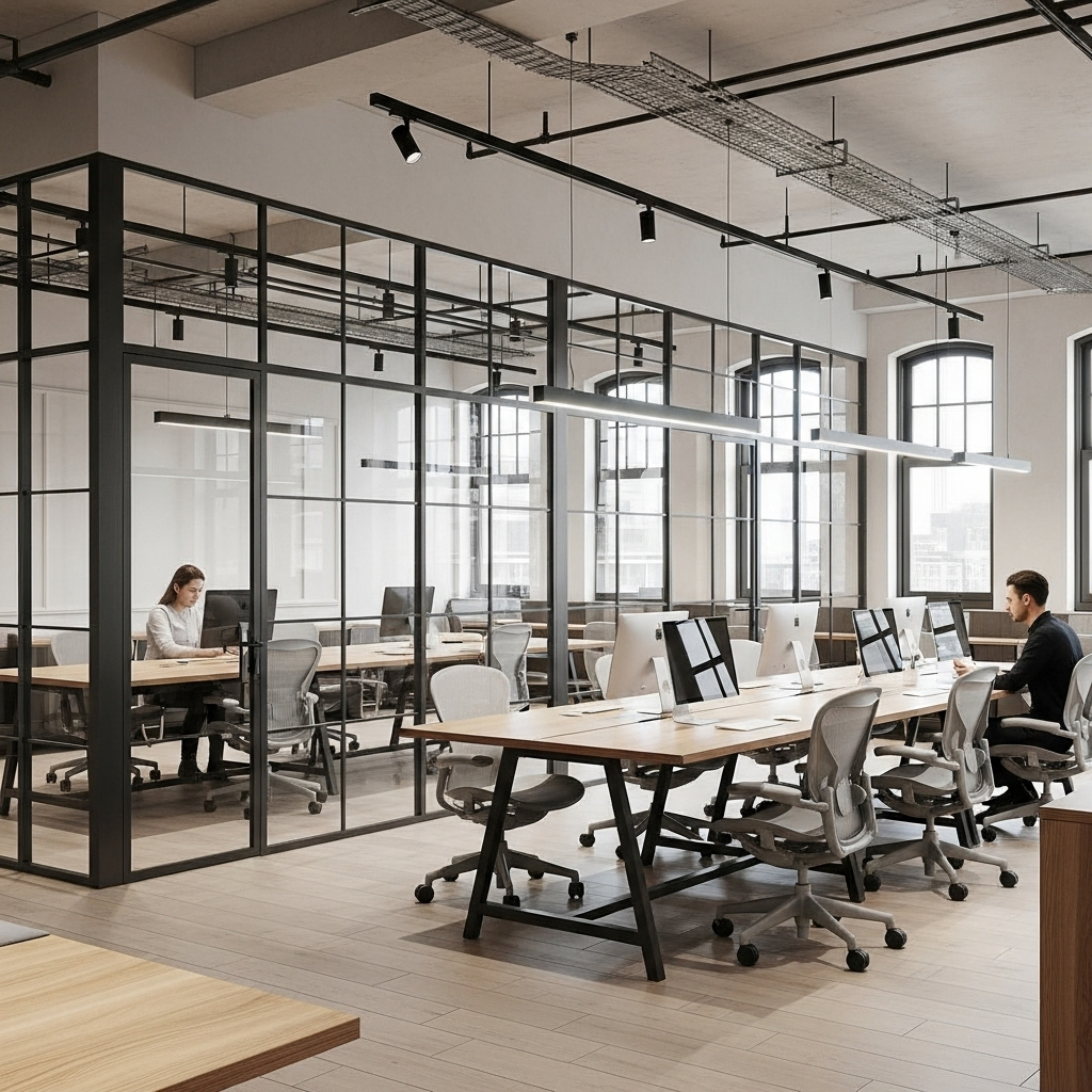 Uma solução sob medida permite que as necessidades de acústica e automação sejam incorporadas desde a concepção. As divisórias de vidro acústico, com vidro duplo, podem ser estrategicamente posicionadas para criar zonas de silêncio. As divisórias de vidro com persianas automatizadas ou as com película inteligente podem ser controladas via sistemas de automação, oferecendo um ambiente dinâmico que se adapta às necessidades da equipe.